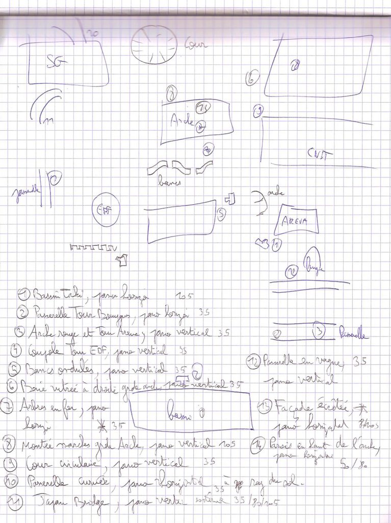 Ces notes se composent d’un plan succinct de la Défense et d’une liste descriptive de mises en scène à réaliser. Grâce à elles, je vais pouvoir dans un second temps repérer les lieux du shooting.
