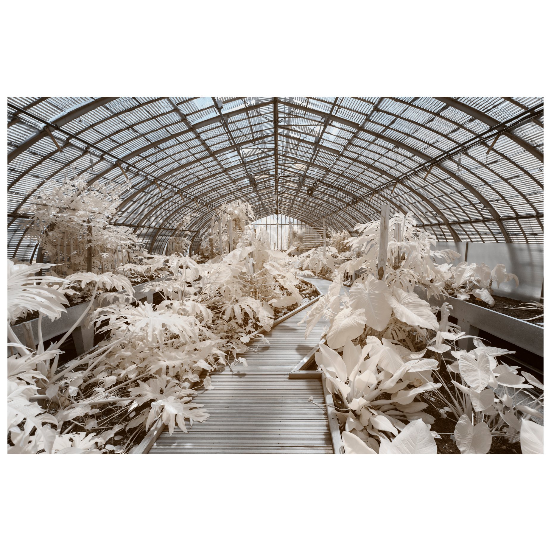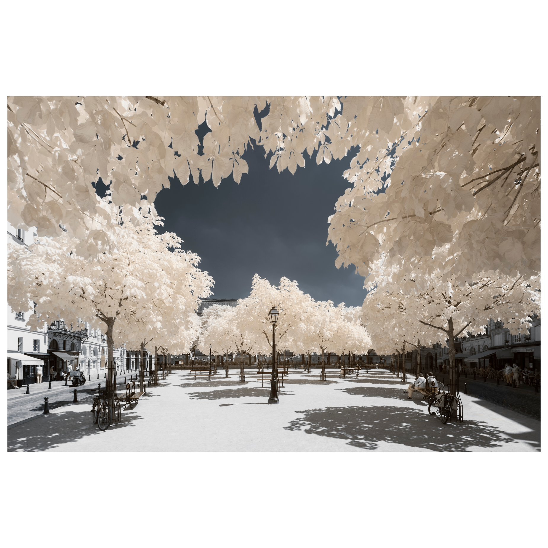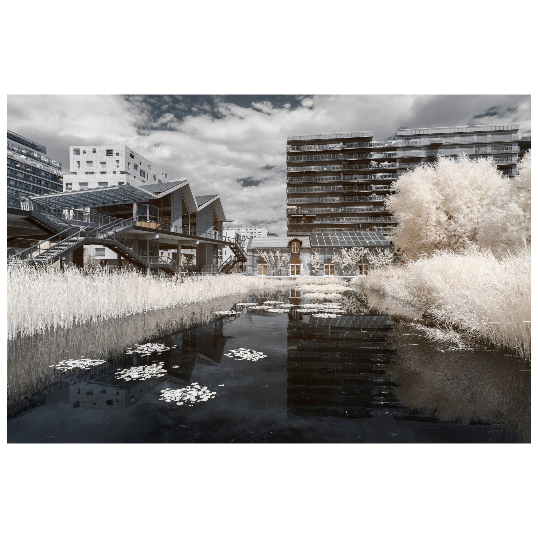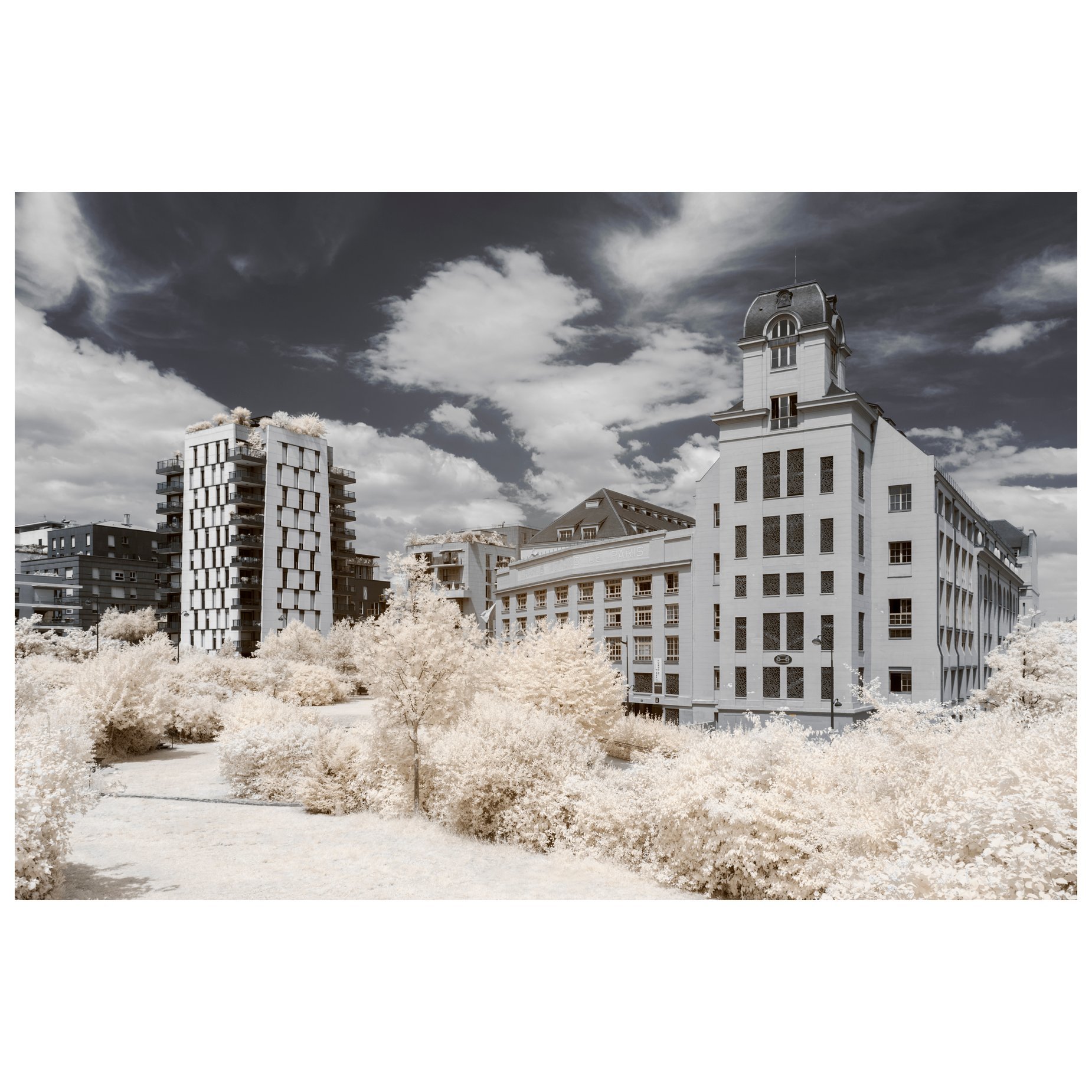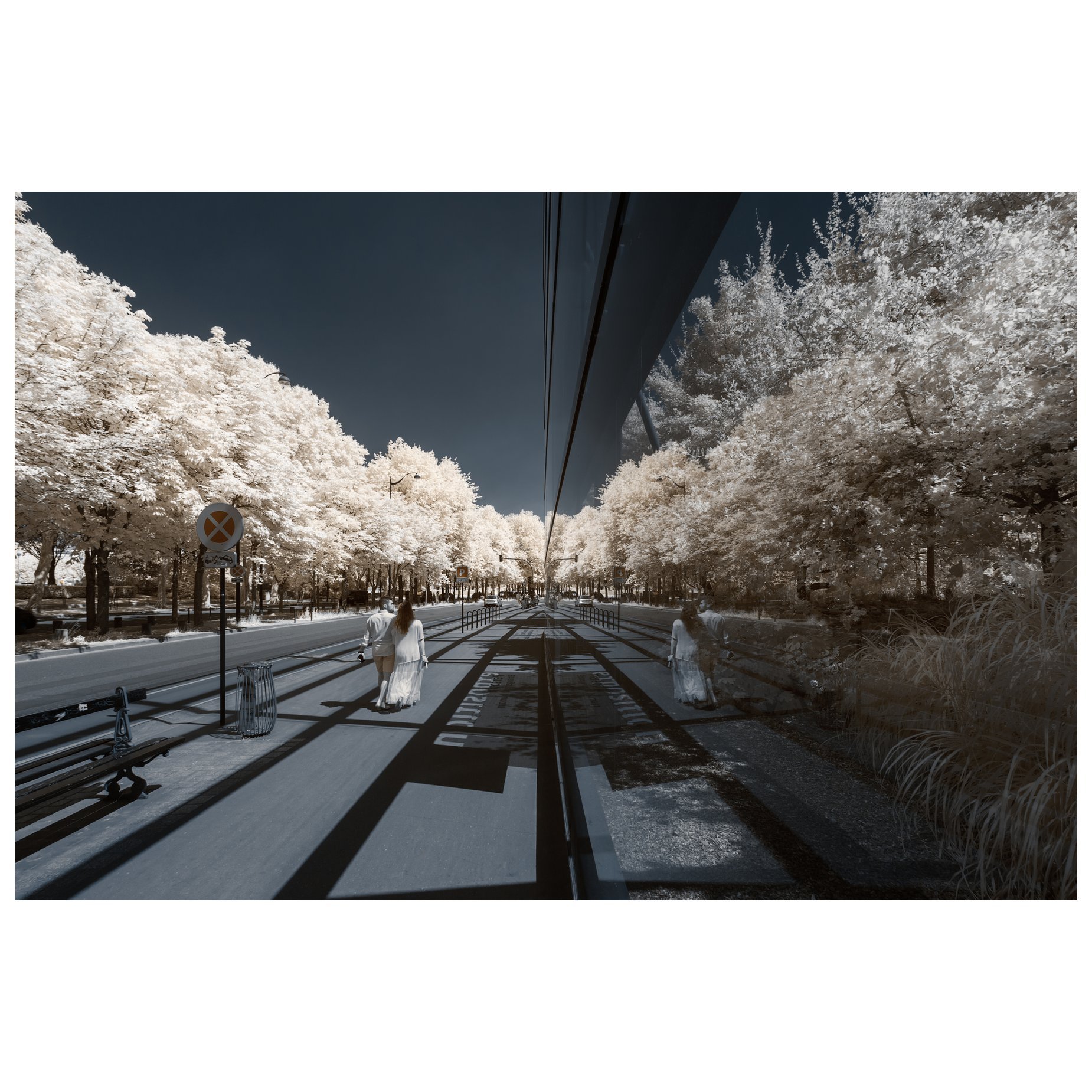 Pour remettre cette nature au premier plan, j’ai voulu la confronter à l’urbanisme à travers la technique de photographie infrarouge. La structure interne des feuilles des arbres, des plantes et des fleurs réfléchie la quasi-totalité du rayonnement infrarouge proche, afin notamment de préserver leur température d’un coup de chaud. En photographie infrarouge, la végétation apparait donc très lumineuse, comme immaculée. Elle vient entourer monuments et espaces publics dans une blancheur onirique.