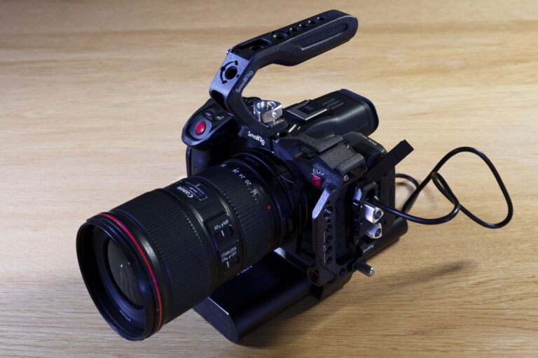 L’utilisation du Canon R5C en vidéo demande un peu plus d’équipement pour vous assurer de bénéficier de ses pleines performances : prévoyez donc au minimum une cage pour fixer divers éléments, une poignée, un serre-câbles et une batterie externe, indispensable pour bénéficier de la video RAW 8K à 60 FPS et d’une bonne autonomie.